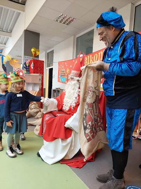Daarna hebben we nog gedanst en gezongen, mochten we allemaal aan Sint een hand geven en kregen we al een eerste cadeautje: